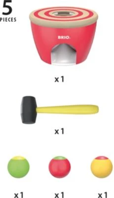Das wird begeistern Hämmer die verschiedenfarbigen Kugeln in den Behäler und höre und sieh, wie sie durch einer von den drei Öffnungen herausrollen. Fang sie auf oder sammel sie wieder ein. Und dann noch mal von vorne, und nochmal!