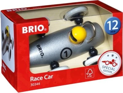 Der klassische BRIO Rennwagen aus Holz in einer neuen Sonderedition mit einer Metallfarbe und Nummer-1-Grafik. Ein Sammlerstück.